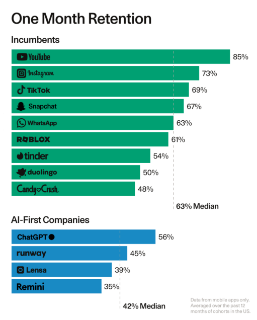 AIGC应用和传统APP第一个月留存率对比,图/红杉资本