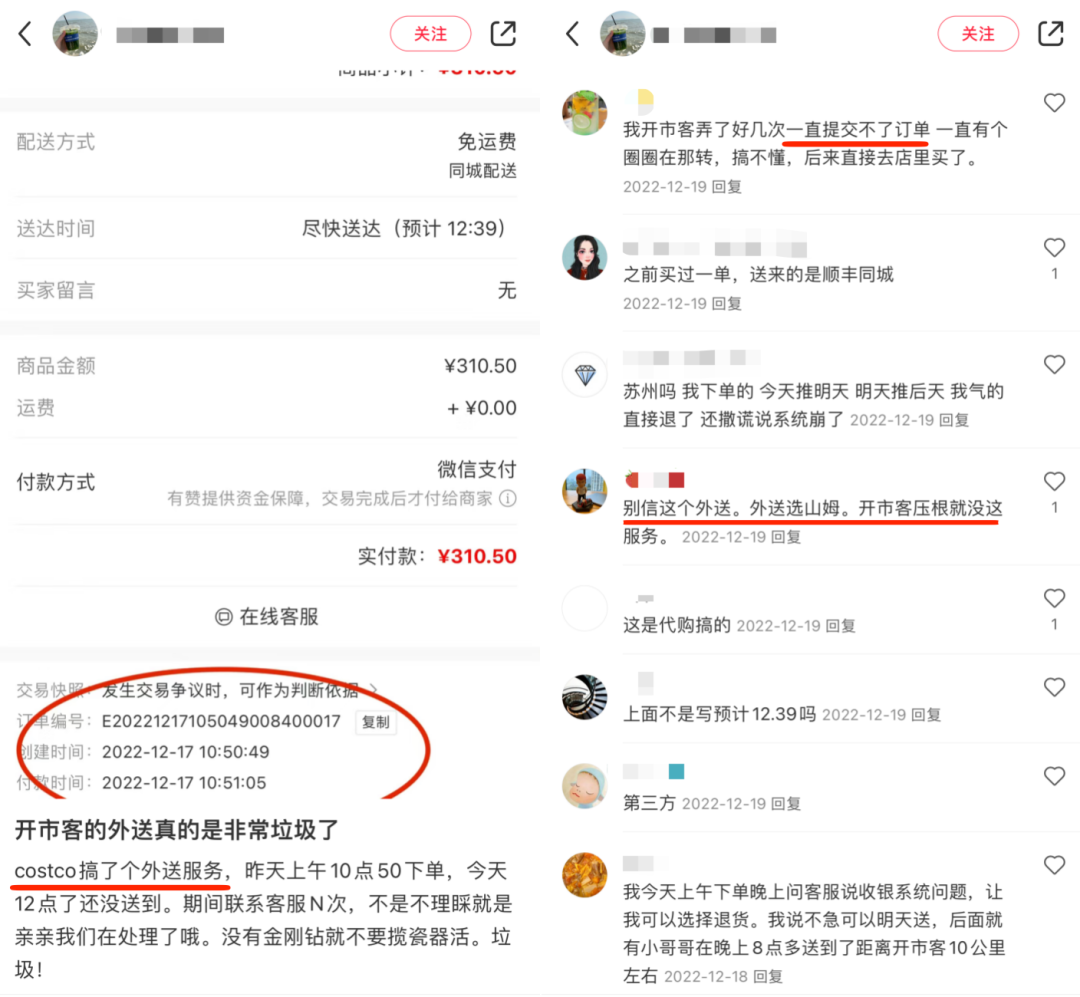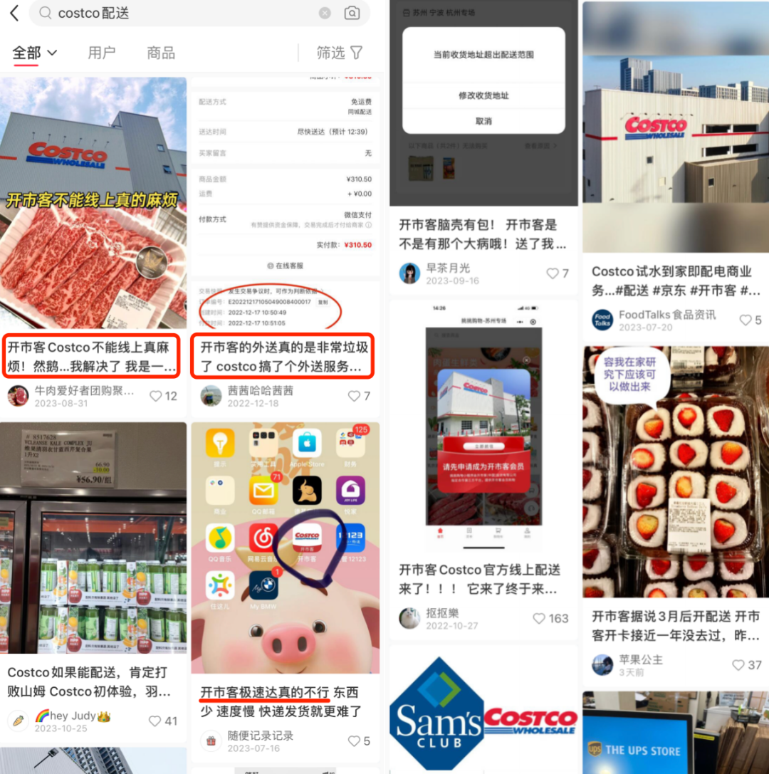 笔者以“Costco配送”作为关键词在小红书等社交平台上搜索发现,目前不少Costco跑腿、代购业务活跃于上海地区。虽然部分消费者对上海Costco开通配送服务抱有期待,但同时“线上比线下贵,还不能挑”等现实考量也是令其抵触的原因之一。
