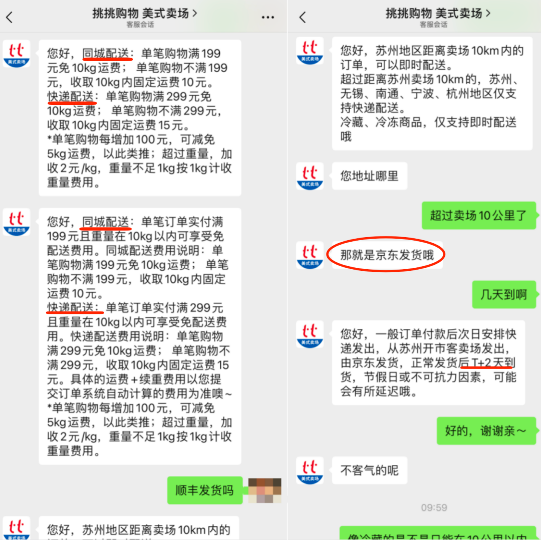 笔者从“挑挑购物”客服处了解到,目前,即配服务仅限苏州卖场10公里范围内,满199元免10kg运费,且冷藏、冷冻商品仅支持即时配送。快递配送则是299元免10kg运费,无锡、南通、宁波、杭州地区仅支持京东快递配送,商品由Costco苏州店拣货打包发货,正常T+2天到货。