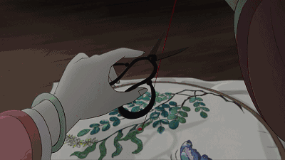就在王初桐跑向六娘家的后门之时,伤心的六娘在阁楼上为王初桐做着最后一件事——刺绣。