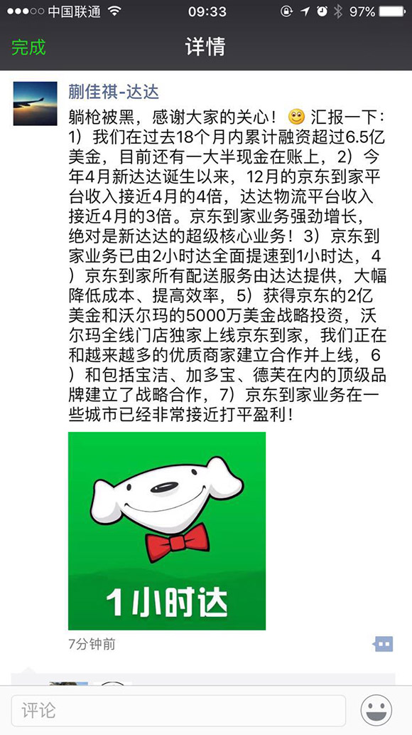 新达达CEO蒯佳祺也对此事做出了回复。他在朋友圈发文披露了新达达的运营状态。他表示,“今年4月新达达诞生以来,12月的京东到家平台月收入接近4月的4倍,达达物流平台月收入接近4月的3倍。京东到家业务强劲增长,绝对是新达达的超级核心业务。” 由此否认了外界对于京东到家关门的传言。