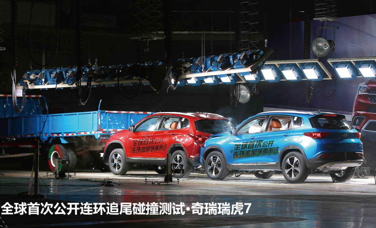 于是,奇瑞对瑞虎7测试的预设场景是:驾驶者开着瑞虎7在高速路上驰骋,突然发现前方车辆因事故全部停下来,此时他紧急刹车,但由于车速过快,在速度下降到50km/h时,最终撞击到前面的另一辆瑞虎7,并引发连环追尾,前车也撞到了更前面的卡车上,成为“夹心层”……也就是说,现场再现了“乘用车追尾乘用车+乘用车追尾卡车”的“三车连环追尾”事故。奇瑞想以此测试向外界展示,如此追尾对车辆和车内人员会造成哪些损失和损伤?瑞虎7的安全性如何?