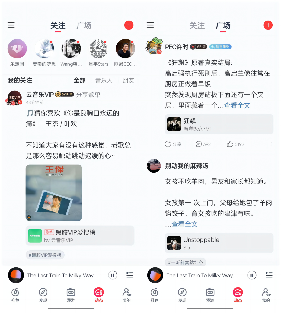 新版的二级页面只有两个:关注和广场,前者是基于关注关心的人与人链接,一直比较稳定;广场页则改为动态为主,大部分动态内容是乐评属性。