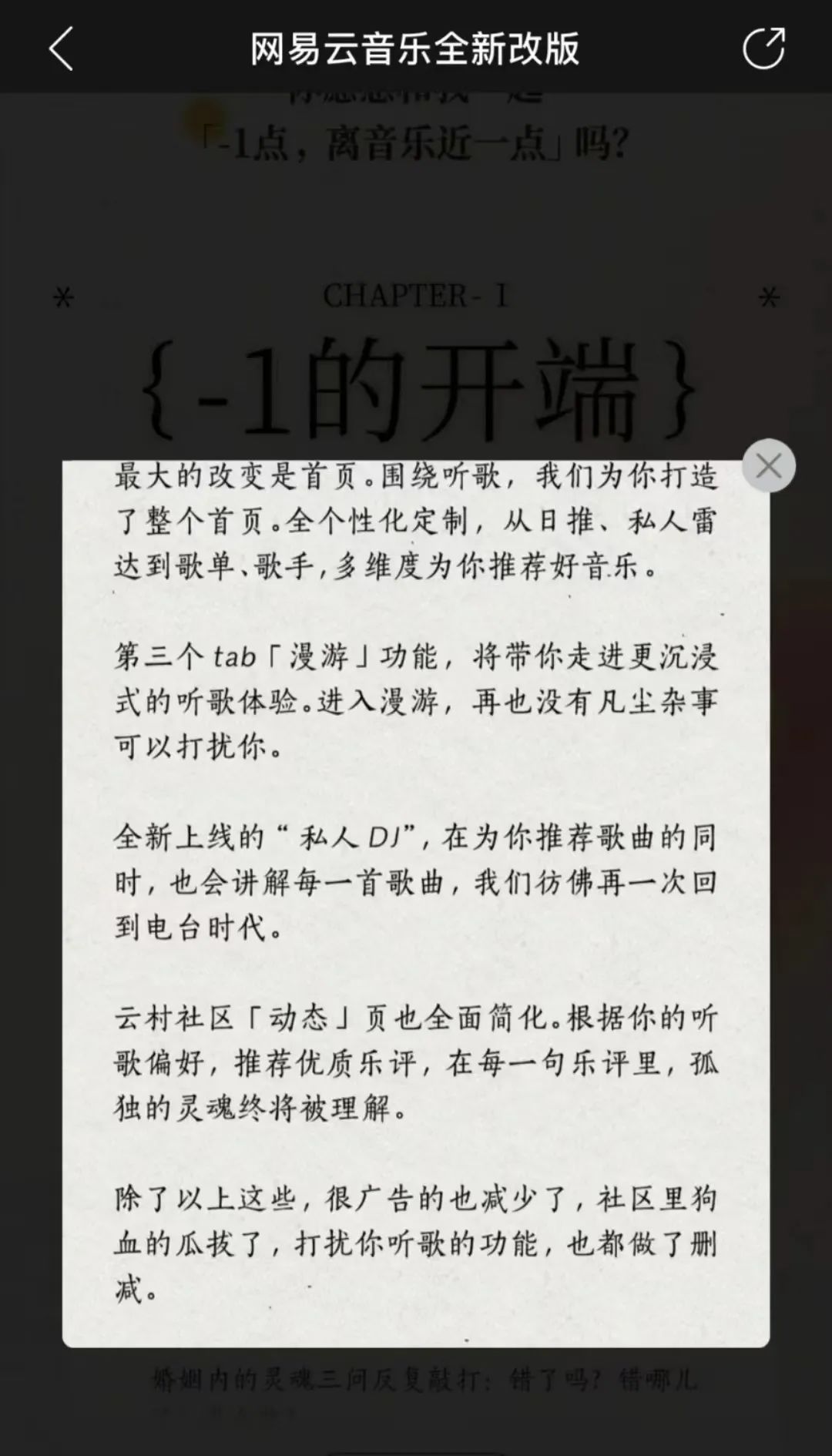 官方公开信也明确地表达,此次改版主旨是“回归音乐”,且和以往平台习惯的不断做加法不同,这次改版想“-1点,离音乐近一点”,包括减少了广告。