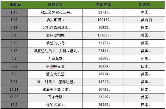 年底上映的《你的名字。》,以5.6亿元的内地票房成绩,创造了日本电影在中国内地最高票房。与此同时,今年从日本引进的其他8部日漫剧场版影片票房也都不错,其中《航海王之黄金城》、《哆啦A梦》、《火影忍者剧场版》均过亿。