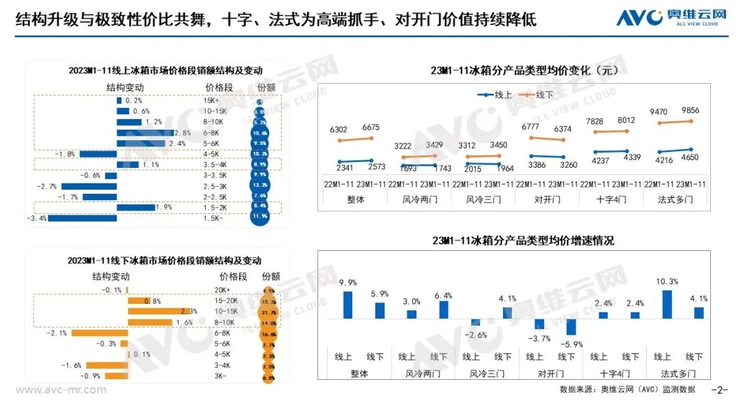 产品价格表现分化,高端与性价比共舞:冰箱市场高端升级仍在继续,十字4门、法式成为高端主要抓手,对开门冰箱的价值持续走低。据奥维云网(AVC)监测数据,2023年1-11月,十字4门冰箱线上线下均价同步提升2.4%,法式多门冰箱线上均价提升10.3%,线下均价增幅为4.1%,而对开门冰箱全渠道价格下探,线上线下均价降幅分别为3.7%和5.9%。