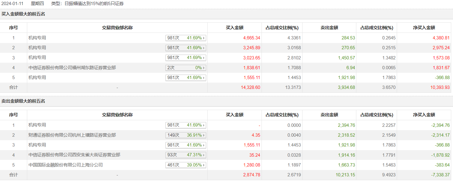 双象股份1月11日跌5.19%,成交额10.76亿元,换手率18.26%,盘后龙虎榜数据显示,三机构专用席位净买入8929.13万元,二机构专用席位净卖出2761.64万元。