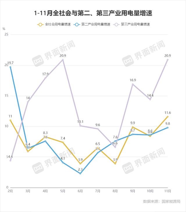 具体分产业来看,仅在11月份,国内第一产业用电量96亿千瓦时,同比增长12.2%;第二产业用电量5277亿千瓦时,同比增长9.8%;第三产业用电量1321亿千瓦时,同比增长20.9%;城乡居民生活用电量936亿千瓦时,同比增长10%。