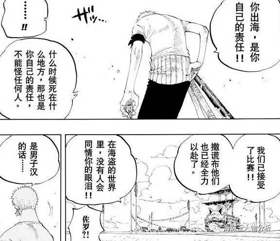 索隆看不下去了:你出海是你的责任,什么时候死在什么地方也是你的责任……没人会同情你的眼泪,是男子汉的话就安静的看这场比赛最后的胜负吧。