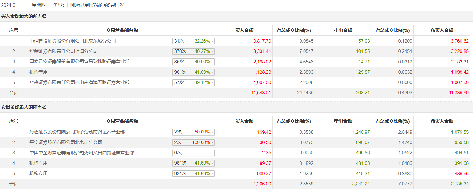 格林精密1月11日涨停,全天换手率23.14%,成交额4.72亿元,振幅22.09%。龙虎榜数据显示,机构净买入1196.71万元,营业部席位合计净买入8007.75万元。深交所公开信息显示,当日该股因日收盘价涨幅达20.00%上榜,机构专用席位净买入1196.71万元。上榜的前五大买卖营业部合计成交1.63亿元,其中,买入成交额为1.27亿元,卖出成交额为3545.45万元,合计净买入9204.46万元。