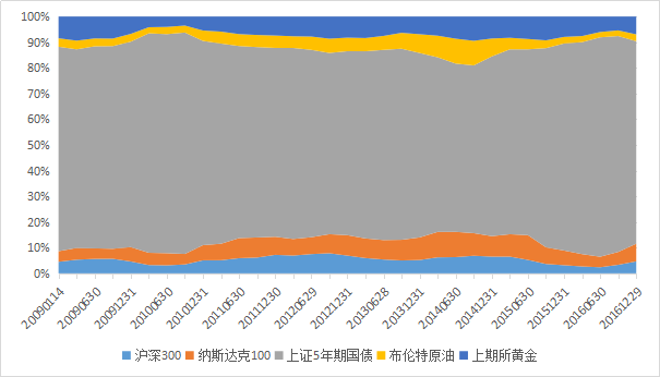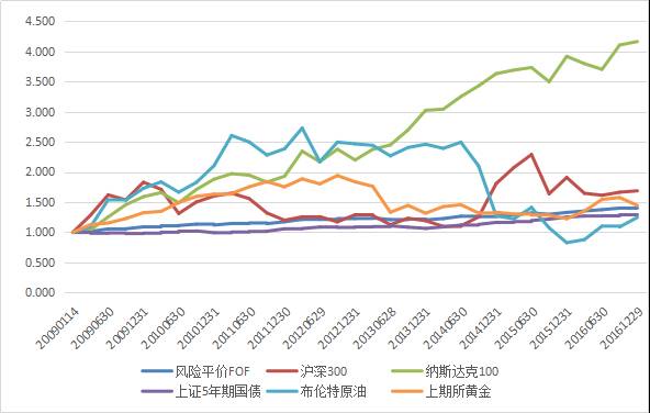 本文选择沪深300指数、纳斯达克100指数、上证5年期国债指数、布伦特原油期货连续合约和上期所黄金期货连续合约为研究对象,重点分析风险平价策略、等权重策略及最小方差策略对组合绩效的影响。除布伦特原油之外,其余四类资产在国内都有对应的ETF产品,因而很容易转化成一个以资产配置为目标的FOF组合。