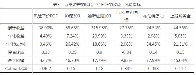 从收益的角度来看,纳斯达克100指数获得了315.95%的累计收益,在五类资产中居于首位。布伦特原油的累计收益处于垫底,为24.53%。风险平价FOF的累计收益高于上证5年期国债和布伦特原油,获得了38.9%的累计收益。由于在不同的市场环境中,风险平价FOF对各类资产都有相同的风险暴露,因此不论是波动率还是最大回撤都处于较低的水平上。由表3可以看到,风险平价FOF的年化波动率仅为3.46%,比上证5年期国债的波动率略高。同时,由于风险平价FOF优化其相应的资产配置权重,所以其最大回撤比五类资产都要低。