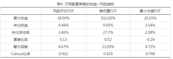 从收益的角度来看,风险平价FOF的收益率和夏普比率在三种策略中占有优势,且累计净值也要好于等权重、最小方差FOF组合。从风险的角度来看,风险平价FOF的波动率高于最小方差FOF,同时其最大回撤在三种策略中也是最高的。但是,从收益--风险的综合指标来看,风险平价FOF和最小方差FOF的表现几乎一致。
