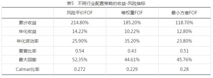 表4列出了各个配置策略的收益及风险。其中,等权重配置的FOF组合年化收益率最高。但由于上证5年期国债的权重分配只有25%,因此其波动率和回撤也是最高的。基于最小方差的FOF组合中,其年化收益率和波动率在三种配置策略中都是最低的。虽然风险平价FOF的年化收益率不及等权重FOF,但是从收益--风险的角度来看,它却是其中最优秀的。
