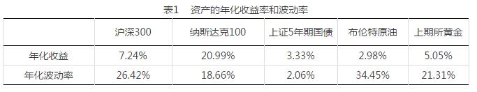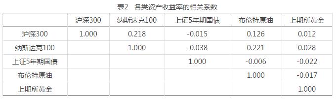 首先,对五类资产的年化收益率、年化波动率及相关系数进行分析。表1和表2分别给出了五类资产的年化收益率、年化波动率以及相关系数。从表1可以看出,不同资产的年化收益率和波动率差异极大。上证5年期国债的年化收益率和波动率在五类资产中最低,分别为3.33%和2.06%;纳斯达克100指数的年化收益率最高,将近21%;另外,布伦特原油的年化波动率高达34.45%,在五类资产中最高。