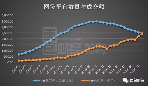平台大量消亡的同时,网贷市场的整体交易规模仍在上涨,这意味着大型平台正在快速抢占市场。数据显示:去年12月份,网贷成交量突破2400亿元,创历史新高;2016年的累计成交量超过2万亿,比上年增长110%。