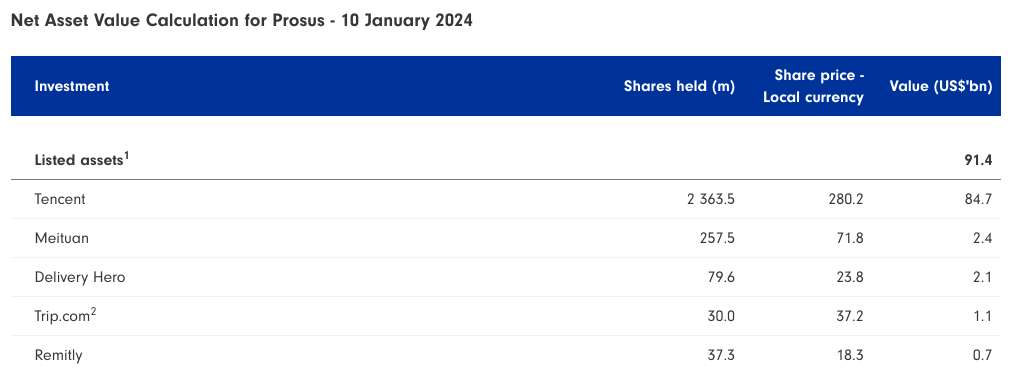1月11日消息,腾讯大股东、南非Naspers集团荷兰子公司Prosus披露数据显示,截至1月10日,公司持有23.635亿股腾讯股份,市值达847亿美元;持有2.575亿股美团股份,市值24亿美元。