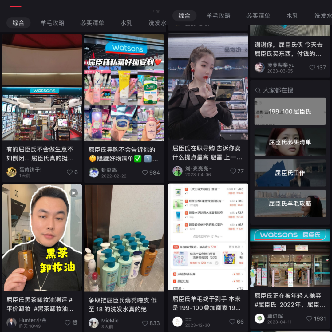 在社交媒体平台上,有关屈臣氏的讨论话题,最多的关键词是薅羊毛、顾客稀少、导购比顾客多等。