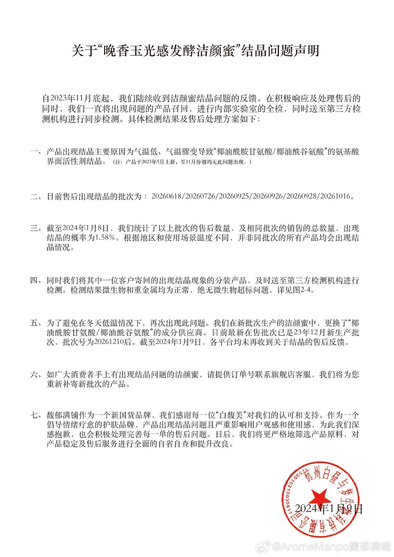 据馥郁满铺声明显示,自2023年11月底开始,品牌就陆续收到有关“晚香玉光感发酵洁颜蜜”产品结晶问题的反馈。