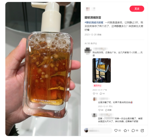 青眼通过社媒平台搜索发现,确有不少消费者发帖反馈该品牌洁颜蜜产品出现结晶或浑浊现象,并质疑是否是产品出现发霉、变质,也有网友认为可能是天气太冷,“放热水里泡泡就好”。