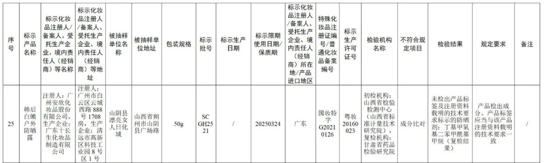 通告显示,韩后白嫩户外防晒露,经相关机构检验,未检出产品标签及注册资料载明的技术要求标示的防晒剂:丁基甲氧基二苯甲酰基甲烷。而该成分俗名阿伏苯宗,是一种很常见的紫外线UVA防晒剂。根据相关法律规定,化妆品包装上需标明所有成分,且成分列表需与备案批件保持一致。