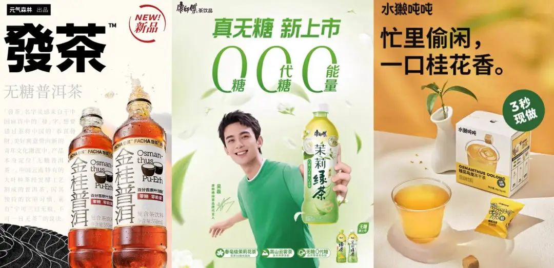 据Foodaily不完全统计,仅在近半年就有数十款无糖茶新品上市。元气森林推出大容量“金桂普洱”發茶,康师傅推出无糖茉莉绿茶,水獭吨吨推出手冲“桂花乌龙”无糖茶...除了传统茶饮品牌,其他饮料赛道的选手也强势入局无糖茶市场:东鹏特饮布局乌龙上茶新品,伊利上市伊刻活泉现泡茶,青岛啤酒上新优活家大麦茶。