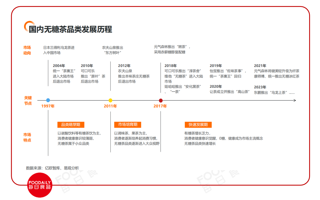 2004年,日本三得利乌龙茶进入中国市场,拉开了国内无糖茶品类发展的序幕。随后,统一、可口可乐相继推出“茶裏王”、“原叶”茶,但受限于消费者健康、无糖意识尚未完全觉醒的局限性,两者相继退出市场。