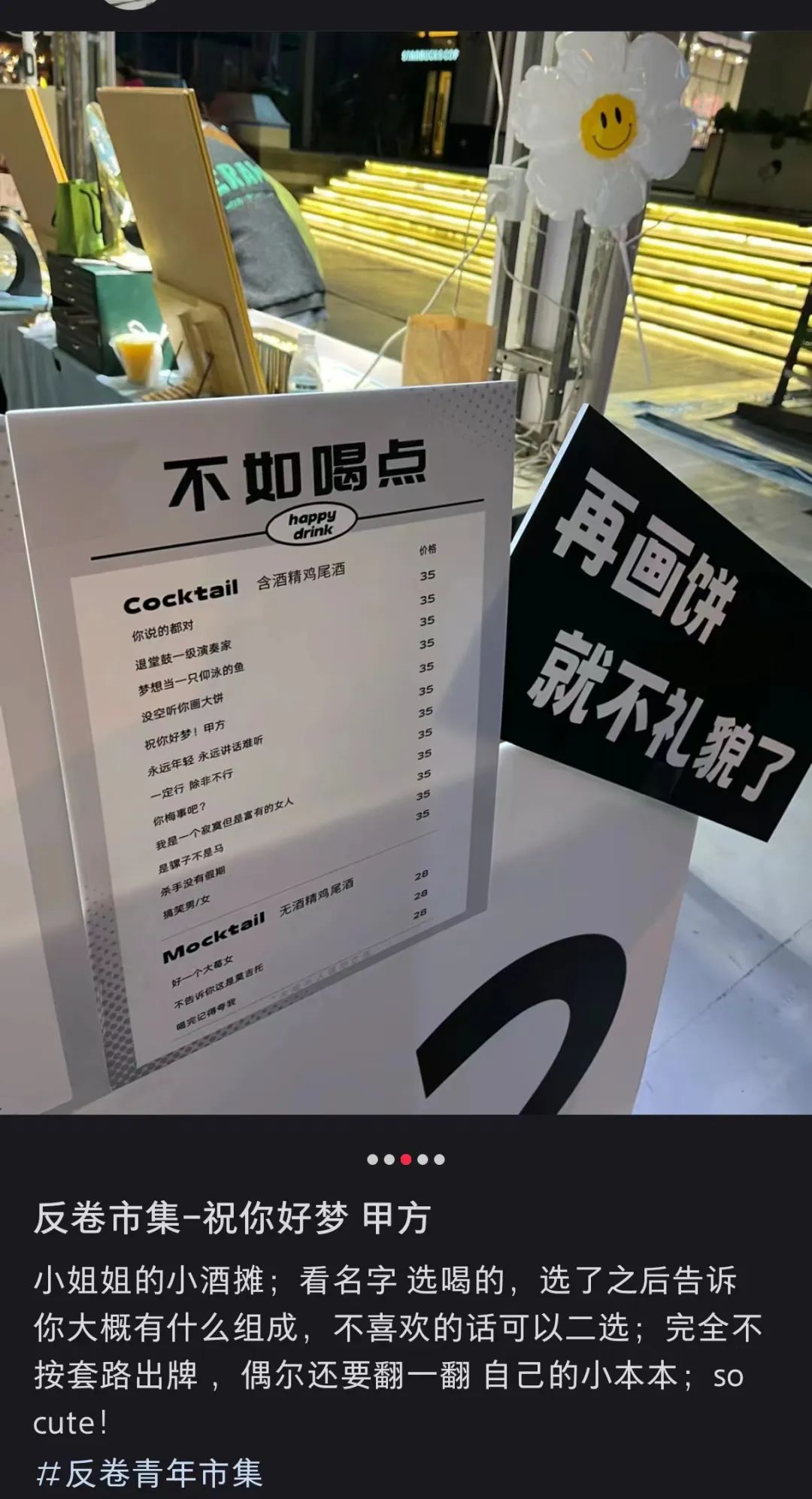 在反卷青年市集里,一位鸡尾酒摊主将打工人的烦恼和精神状态化为饮品名字,「没空听你画大饼」、「永远年轻 永远讲话难听」、「祝你好梦!甲方」等统统售价35元。