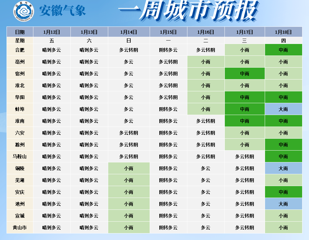 18日(周四):安徽全省阴天有小雨,其中沿江江北部分地区中到大雨。