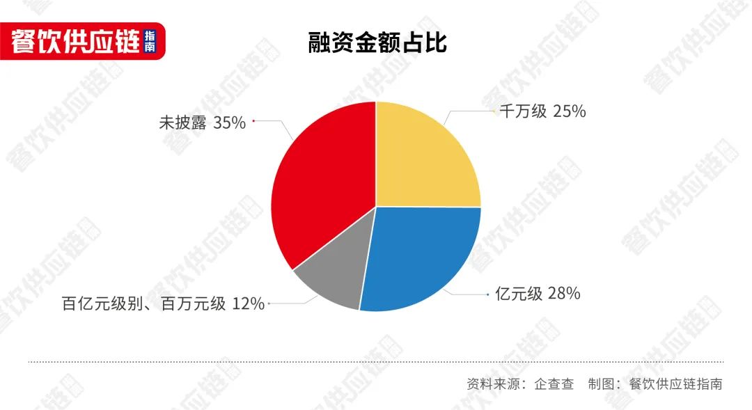 餐饮供应链领域共发生了17起亿元级别的融资事件,占比达28%。千万级别的15起,占比达到25%。另外,还有35%的融资事件未披露具体融资金额。