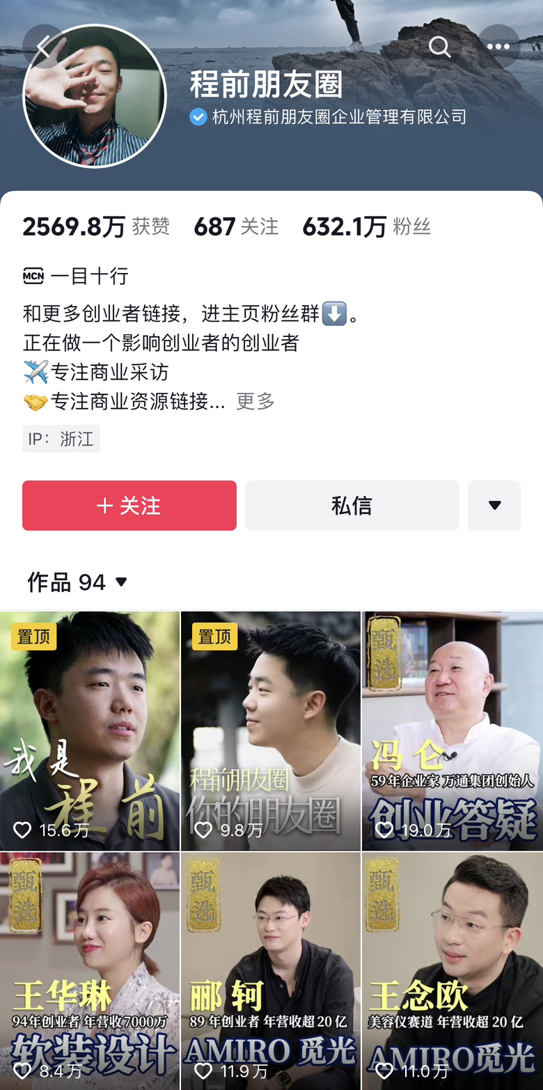这位最近在社交媒体上引发“公愤”的博主名叫程前,是一位在商业访谈类赛道做到头部级别的视频博主。