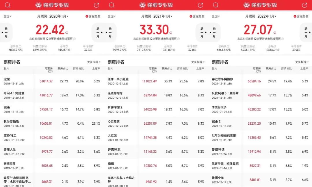 纵览近五年一月市场大盘,除了2023年春节档时间较早之外,剩余每一年的贺岁、元旦档影片都在一月承担着票房产出重任。可以看到,自2020年到2022年三年间,一月票房前三影片皆出自这两个档期。