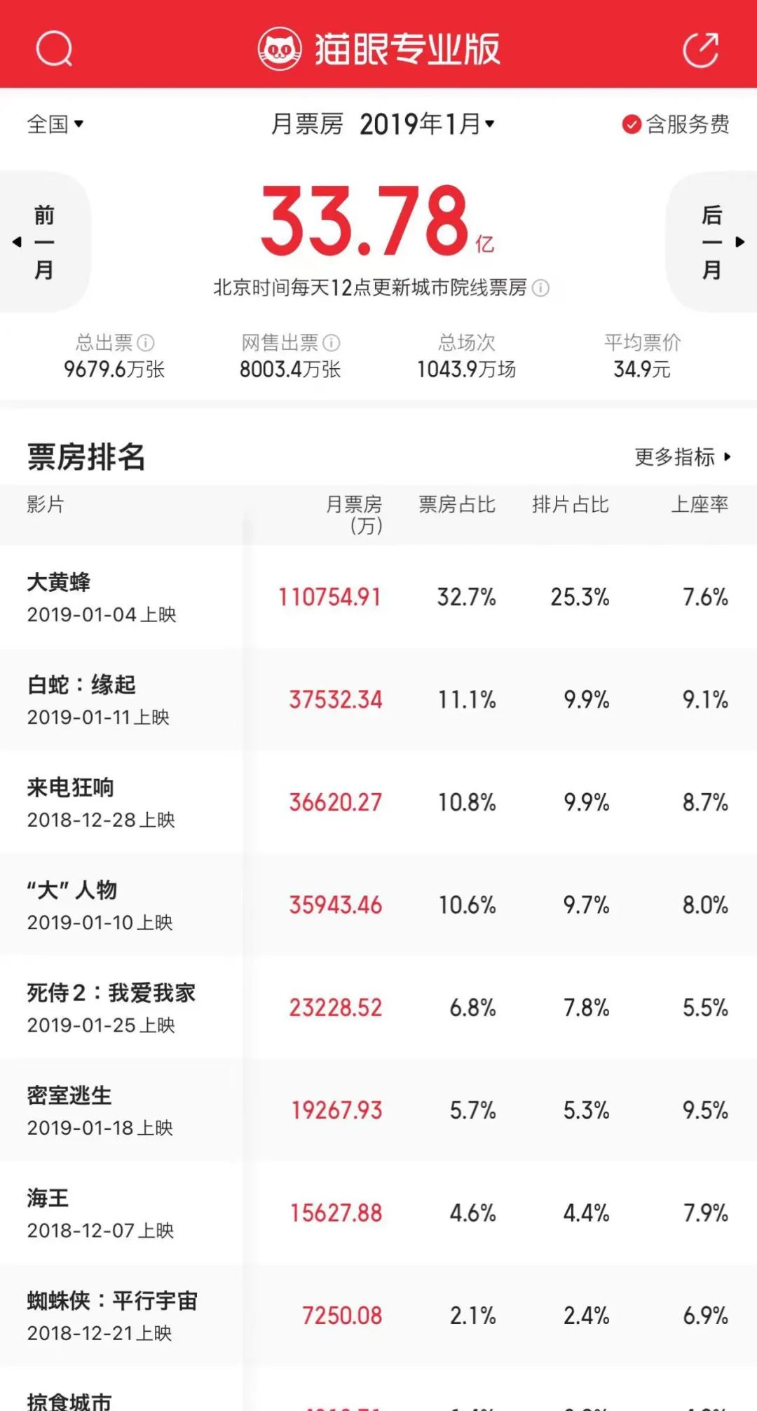 以2019年同期为例,尽管春节档同样较晚、一月定位同样尴尬,但仍然有不少项目来填补市场空缺,月度票房达到了33.78亿元。