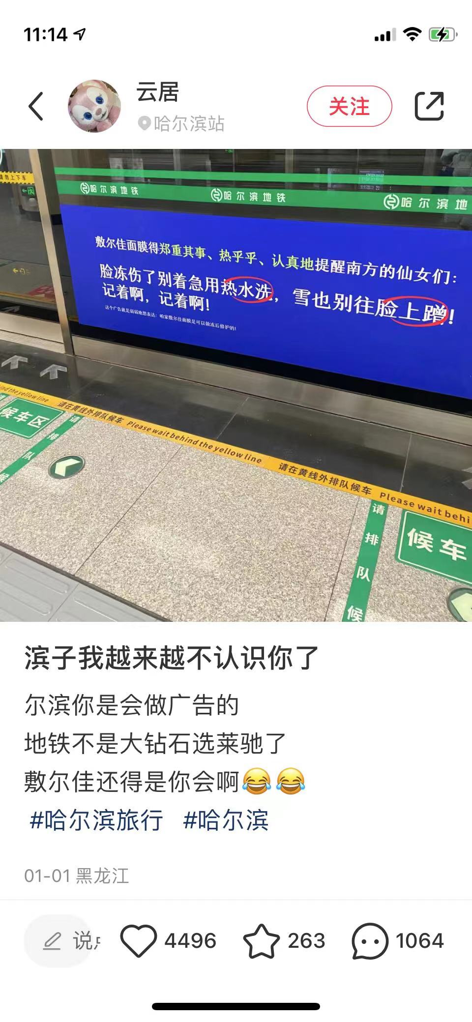 在社交网络上获得好评后,敷尔佳继续强化品牌人设和修护场景,喊出“来尔滨修护心灵,用尔佳修复肌肤”的口号。作为尔滨的小弟,和大哥一起招待来自远方的“qie”。毕竟跨年的热度只是前菜,哈尔滨真正的旅游旺季——寒假和新年还在路上。