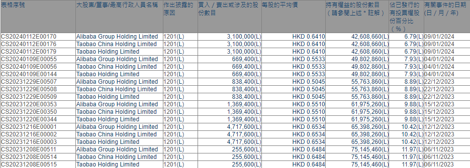 港交所文件显示,阿里巴巴集团于2024年1月9日以平均每股0.6410港元的价格出售310万股快狗打车股份,持股比例从7.28%降至6.79%。自2023年11月6日起,阿里巴巴集团已累计6次减持快狗打车股份。