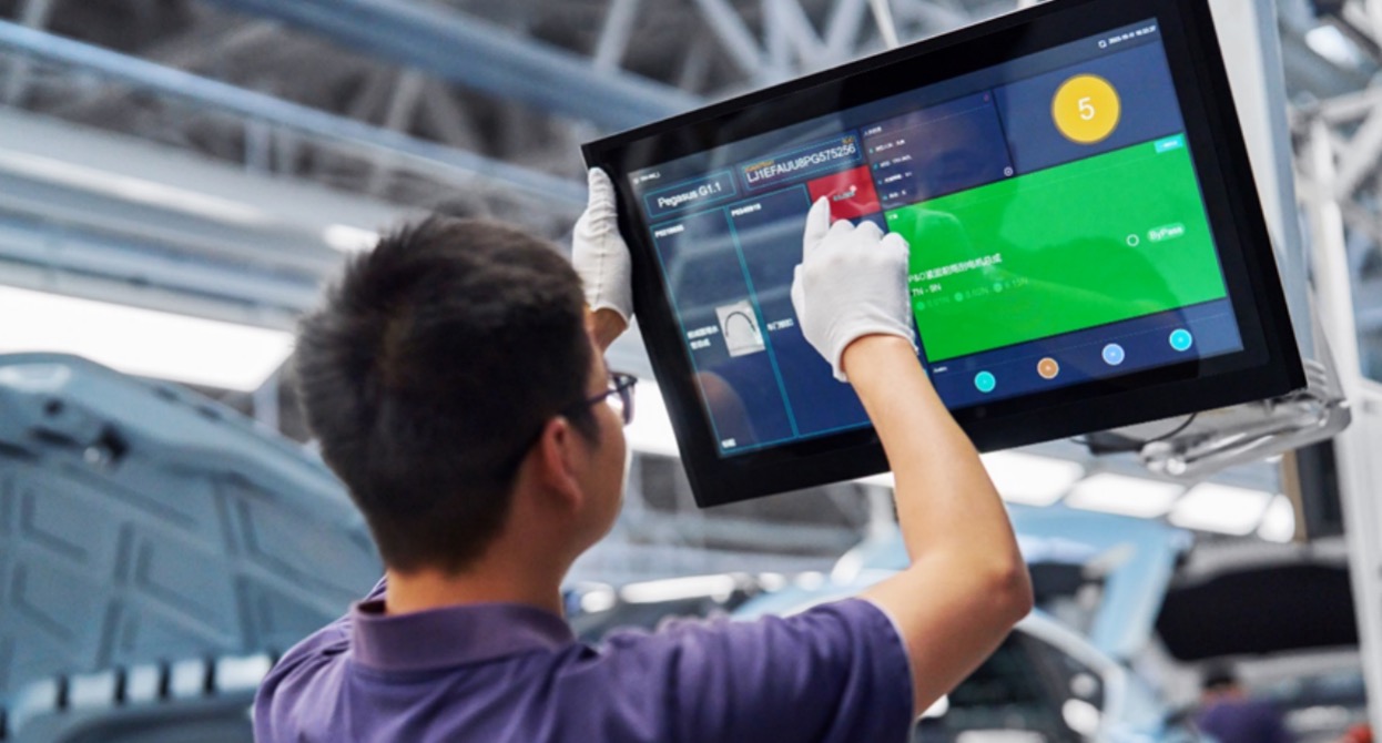 为提升工作效率,厂内大规模部署了工位屏幕以便实时检测安装效果。在工位屏的指导下,工作人员手持智能化扭矩枪即可完成拧紧操作。