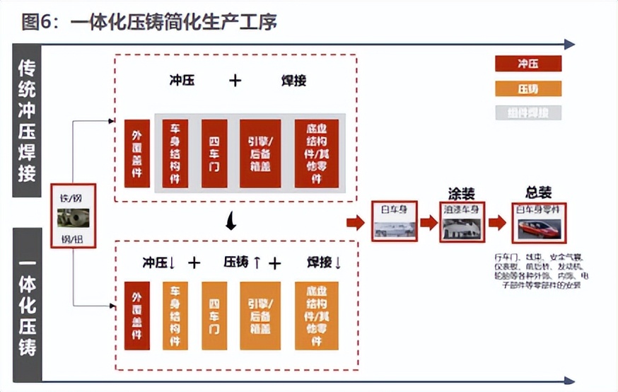 在汽车生产制造过程中,有冲压、焊装、涂装和总装四大工艺,原材料经过四大工艺的“装饰”后,就变成了一辆白车(整个轿车零部件的安装载体,是汽车的基本骨架,其生产成本约占整车的 45%~65%),一体化压铸技术可以应用到冲压-焊接环节中。在传统工艺中,这两个环节需要多道工序,工艺操作繁琐,效率有待提高。
