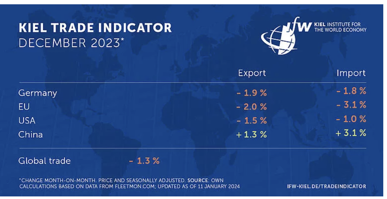 该机构贸易政策研究中心主任兼基尔贸易指标负责人欣茨(Julian Hinz)表示,由于红海紧张局势,部分商船改道非洲好望角,这导致亚洲生产中心与欧洲消费者之间的货物运输时间大幅延长,“最长可达20天”。它带来的后果是欧盟和德国的外贸数字环比明显下降,“因为运输的货物现在还在海上,还没有按计划在港口卸货”。