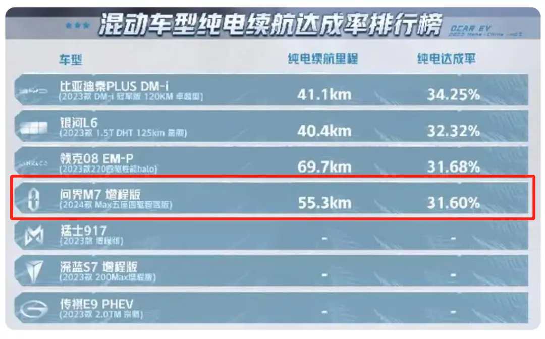 其中在“混动车型纯电续航达成率排行榜”中,华为车BU董事长余承东口中超越丰田埃尔法、雷克萨斯LM等百万豪车,“遥遥领先”的问界M7竟然排名垫底,其纯电达成率只有可怜的31.6%,而在其他榜单中,吉利、长城旗下的多款车型在测试中续航达成率也均不到40%。