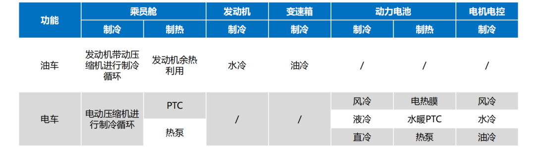 相比于燃油车“发动机+乘员舱”的热管理构成,新能源汽车由于新增了“三电”系统,将发动机“拆分”为了动力电池与电机电控两个模块,所以热管理方案也变为了“空调系统+动力电池系统+电机电控”三个模块。