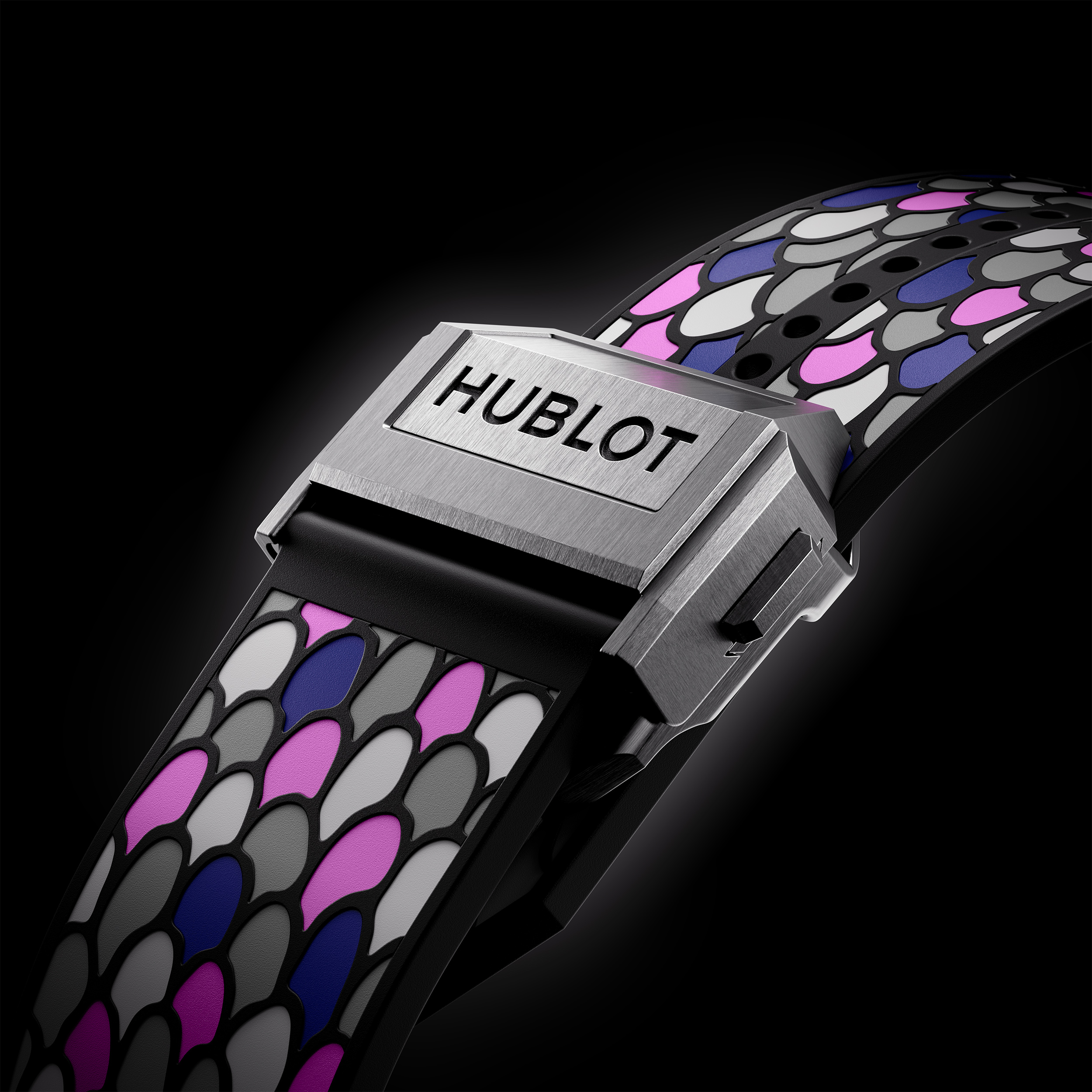 龙形轮廓延伸至宇舶表首创的,采用镶嵌艺术图案的橡胶表带上。每片龙鳞均经过染色和纳米硫化工艺处理,以便与表带无缝融合。这一精细的装饰工序完全由手工完成,每条表带的制作工时约为8小时。