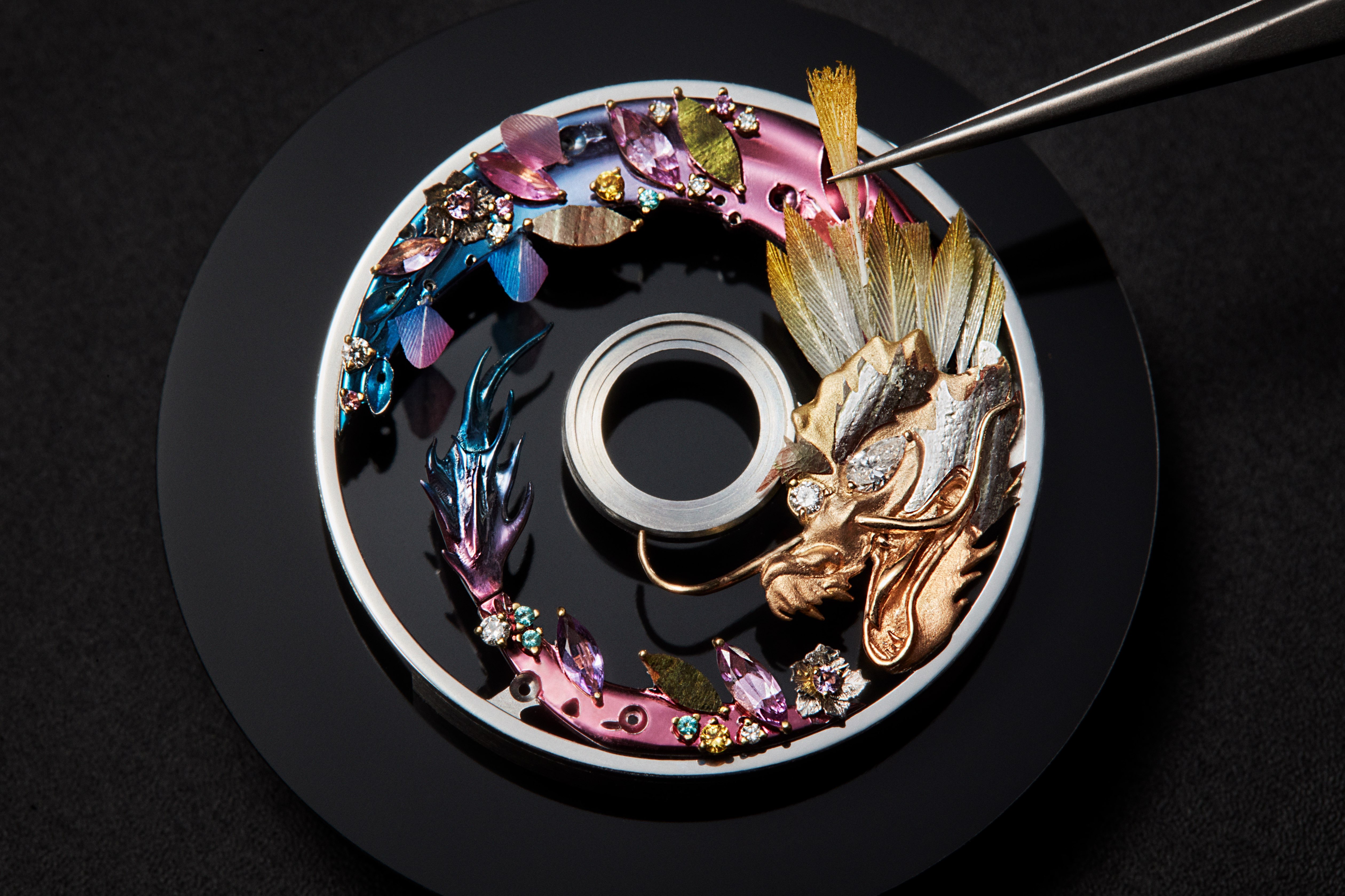 这款腕表旨在庆祝龙年的到来,是对东方龙所蕴含的“融合的艺术”的隐喻。龙这种神圣生物,其形态历经数千年演变而成,具有九种不同动物的特征——虾眼、鹿角、牛嘴、狗鼻、鲶须、狮鬃、蛇尾、鱼鳞、鹰爪。陈粉丸匠心独运,将这一神圣的动物、护身符和图腾呈现于表盘之上,以此向中国最富文化底蕴的艺术形式之一——剪纸艺术致敬。