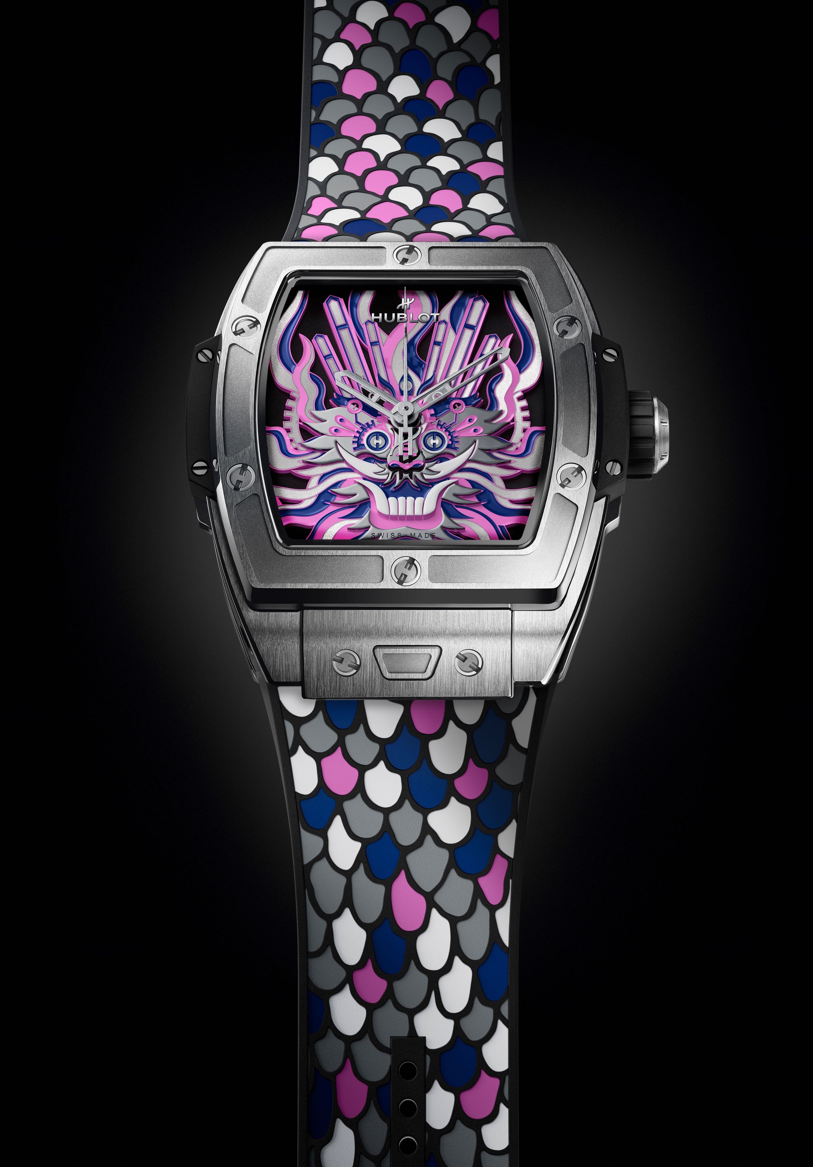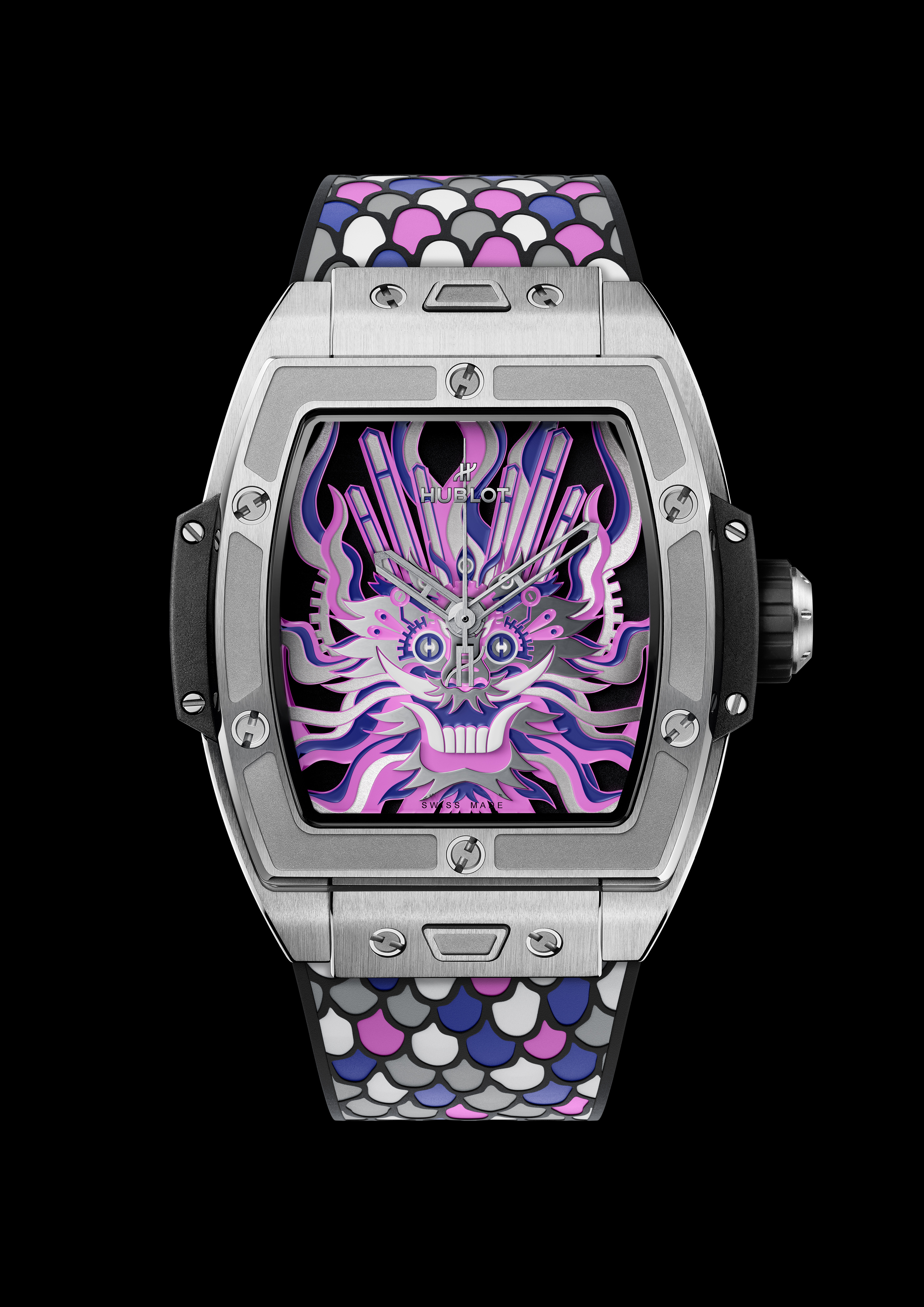 HUBLOT宇舶表倾心融合中国文化三重底蕴:以东方龙(又称‘loong’)为设计灵感源泉,选用剪纸及镶嵌艺术两大艺术形式,携手中国艺术家陈粉丸,联袂打造HUBLOT宇舶表Big Bang灵魂甲辰龙年钛金腕表。