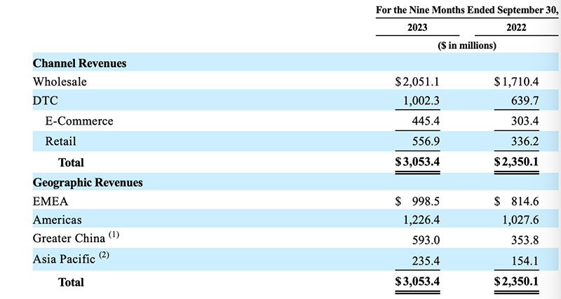 据招股书,2020年至2022年,亚玛芬营收分别为24.46亿美元、30.67亿美元、35.49亿美元,复合年增长率为20.4%。2023年前三季度,亚玛芬营收30.53亿美元,同比增长约29.9%,其中大中华区就贡献了5.93亿美元 ,同比增长约67.6%。