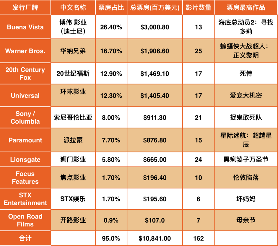 迪士尼在二当家的位置连坐三年后终于翻身成为冠军厂牌,并且大获全胜,遥遥领先于第二名华纳,30亿美元的成绩创造迪士尼发行新高。其成功源于迪士尼本部(疯狂动物城),皮克斯工作室(《海底总动员2》),漫威影业(《美国队长3》),卢卡斯影业(《星球大战外传:侠盗一号》)四大影业部门同时发力,当年的“买买买”政策终于在今日开花结果,其出品并发行的《海底总动员2:寻找多莉》成为2016年票房最高的影片。