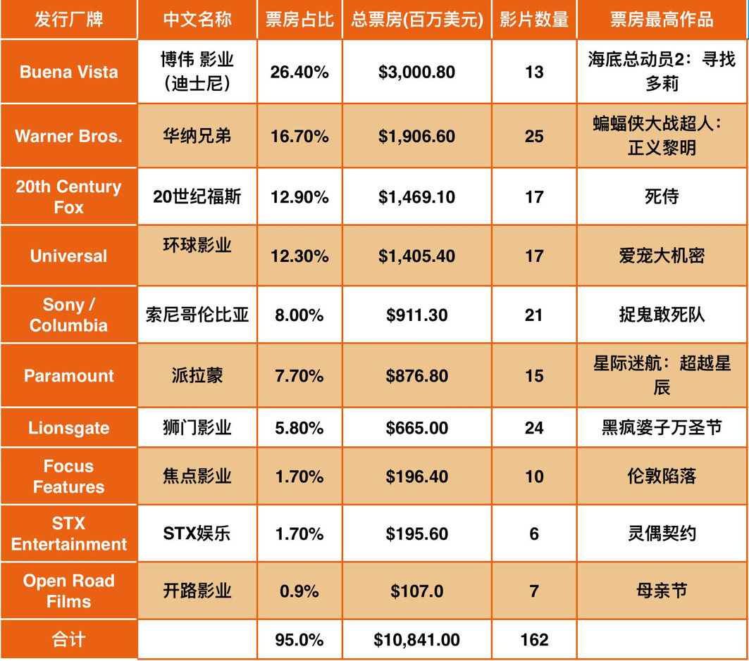 最为亮眼的当属迪士尼旗下皮克斯工作室出品的《海底总动员2:寻找多莉》;这部时隔十三年的续作刷新了北美最卖座动画电影纪录,成为第一部票房杀入北美历史前十的动画影片(排名第七)。年末迪士尼旗下卢卡斯影业的《星球大战:侠盗一号》也轻松刷破多项纪录,很大程度上延续《星球大战7:原力觉醒》的热度。同时“漫威大法”持续吸金,《美国队长3:英雄内战》和《奇异博士》两部漫威宇宙作品分别拿下5月和11月票房冠军。迪士尼本部的原创动画《疯狂动物城》、《海洋奇缘》以及奇幻童话作品《神奇森林》等也都有极佳的表现。