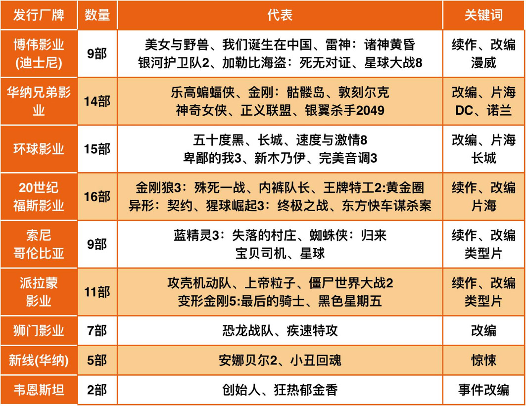 2017年已公布片单显示迪士尼虽然在作品数量上不占优势,但握有《雷神3》、《银河护卫队2》、《加勒比海盗5》、《星球大战8》等超级票房炸弹(Blockbuster),有很大机会蝉联。而纵观整个片单,几大厂牌都把重心放在了续作开发和IP改编上,明年平均每两个月就要有至少一部超级英雄影片上映。