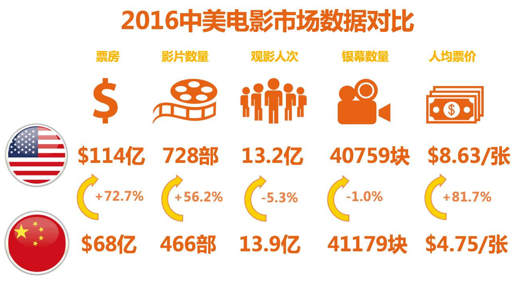 2016是好莱坞光彩夺目的一年,北美地区共上映影片728部,累计观影人次13.2亿,累计票房113.7亿美元,人次和票房分别较去年上涨了0.1%和2.2%,2016年总票房刷新了北美年票房纪录。