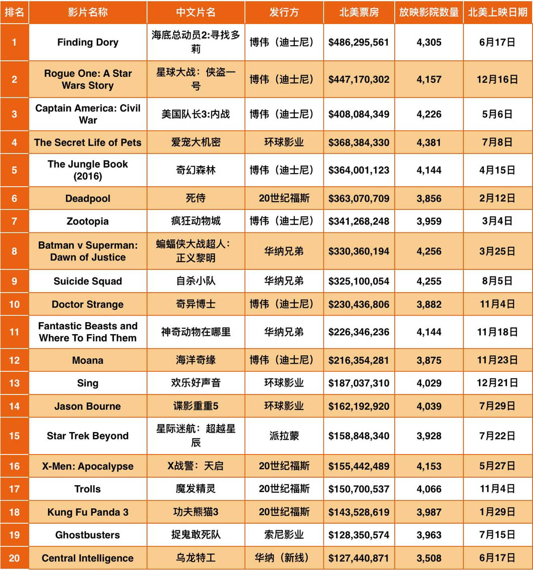 2016北美票房前20影片信息汇总: