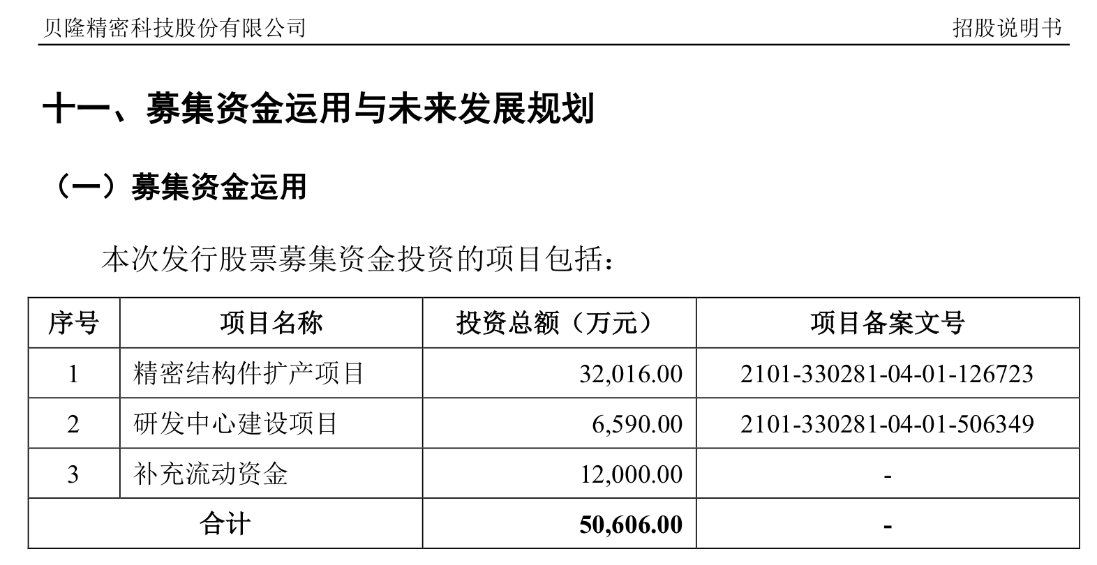 从2024年1月3日披露的招股说明书中可以看到,贝隆精密的募资计划额是5.06亿元,投入到“精密结构件扩产项目”3.2亿元,“研发中心建设项目”6590万元,“补充流动资金”1.2亿元。如此一来,贝隆精密IPO最终解决了近4亿元的募资,出现了“打折”。根据公告贝隆精密网上发行,已占发行总量的100%。